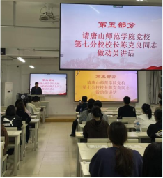 然后,唐山师范公司党校第七分校董事长陈克良进行了动员讲话。陈书记的讲话中提出三点要求:第一,对于追求党,想要成为党员,表示赞赏和肯定,同学们要加强党知识的学习,在培训班学到党知识,同时吸收知识。第二,有正确的入党动机,知道为什么要入党,熟知党的性质、宗旨、义务和权利,习近平总书记成提出:人民对美好生活的向往,就是我们终身的追求——而这也是所有入党积极分子的价值追求。第三,要求积极分子端正学习态度,努力成为各方面发展的佼佼者。同时,陈克良书记提出了培训期间的具体要求:要遵守纪律、及时做笔记,要用科学理论武装头脑。对于当下疫情工作,陈书记指出,师生志愿者为大家做出了很多默默无闻无闻的贡献,呼吁同学们要紧记疫情当下,安全第一!同时认真学习,努力提升,迎接二十大的召开。