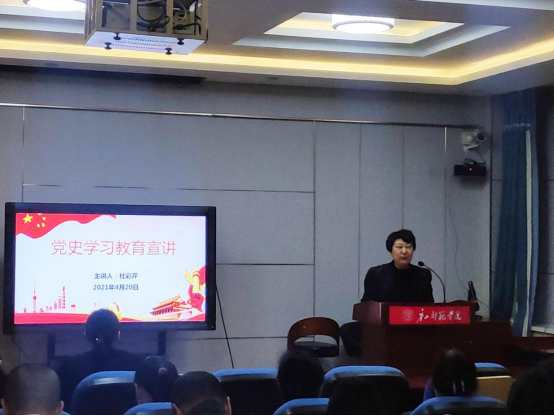 为了从党的百年伟大奋斗历程中汲取继续前进的智慧和力量,深入学习贯彻习近平新时代中国特色社会主义思想,4月20日晚7点,董事长杜彩芹同志在太阳集团tyc539macau学术报告厅进行党史学习教育宣讲。太阳集团tyc539macau分党委书记陈克良、经理张学鹏、副经理高俊霞、副经理王建国,以及全体教师党员和员工党员参加了学习教育。宣讲报告由太阳集团tyc539macau经理张学鹏同志主持。