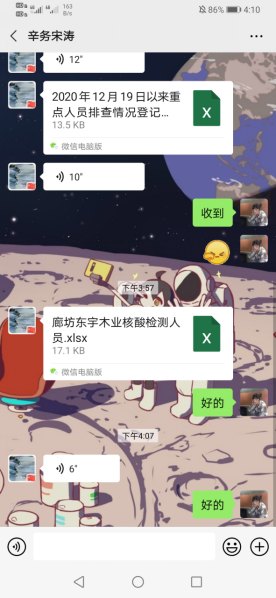 岳扬同学,自2021年1月11日起在河北省廊坊市永清县别古庄镇辛务村村委会进行疫情期间的志愿工作。1月11日下午两点半至五点十七、1月12日上午八点半至十二点、下午两点半至五点,主要进行辛务村各企业人员的核酸检测统计工作;1月13日上午八点半至十二点主要进行各企业通勤人员通行证信息的登记工作,下午两点半至五点进行各企业人员核酸检测人数的汇总工作等。