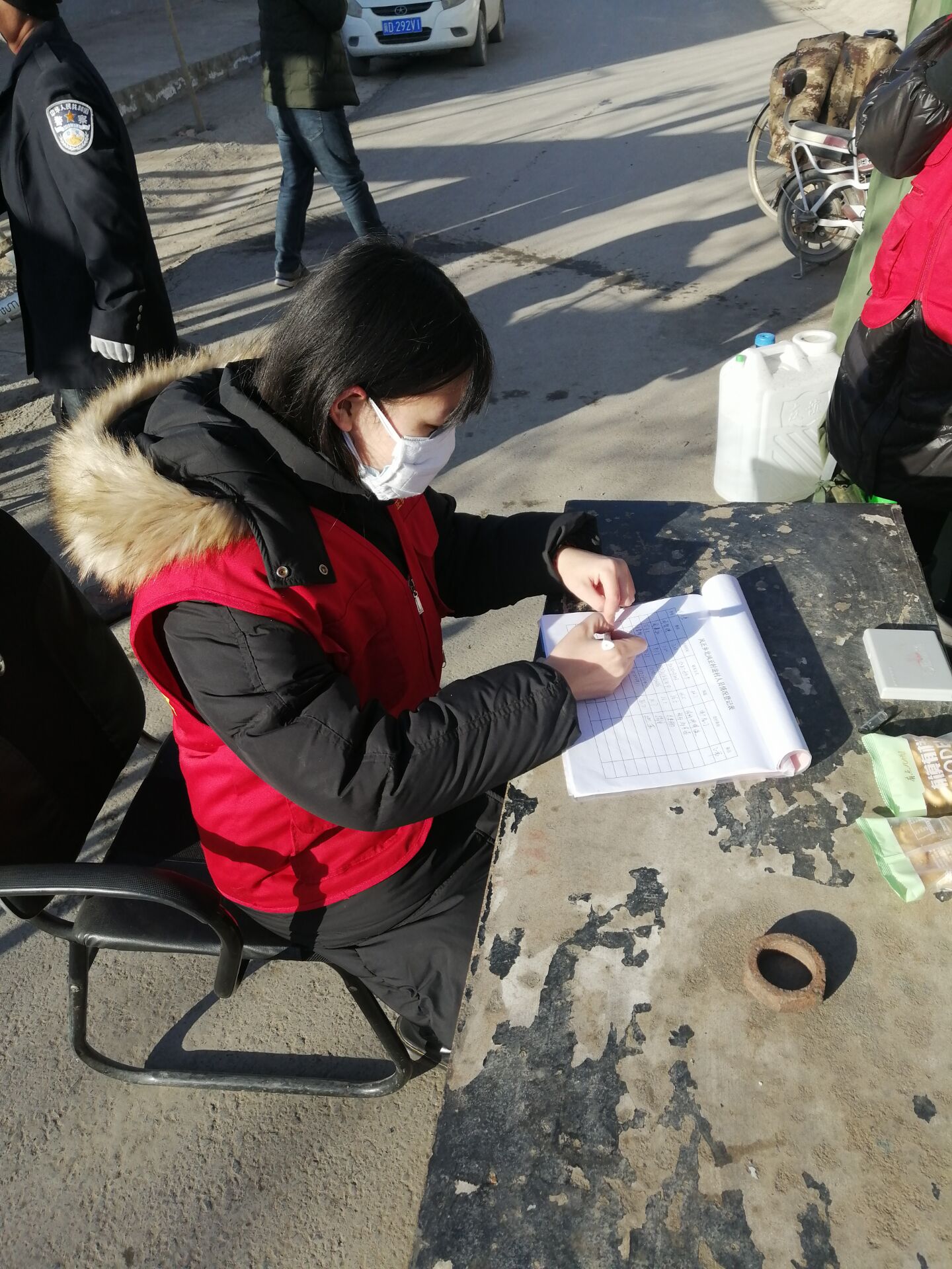 早晨还不到八点钟,刚刚吃过早饭的她就赶到北风正村的卡口处,来接替值夜班的村干部们。看着经历过一整夜一丝不苟地坚守在岗位上的疲惫的长辈们,她的心更加坚起来:一定要做好这份志愿工作,我还年轻,我还能为大家多做点事情!她对过往人员、车辆进行登记,确保每个进村的人都有迹可循;她给人们测量体温并喷洒消毒液,使村内人们的安全得到了保障;她还利用村中的广播给人们讲解防护措施,使村中的每个人都参与到这场“战役”中。在每一个环节中,她都会做得一丝不苟、有条不紊。当她发现有体温超过37.3℃的人,她会立刻向村委会报告。由村委会决定下一步动作。她每天都在村里进行消毒工作,记录来往路人的信息,禁止外人进入,车辆一律不允许通行。在工作前期,她也曾为这些繁琐的工作而感到厌倦和疲惫,但是,当她每次看到新闻上播出的感染人数那惊人的数字时,她决定做一个坚强的女青年,在自己的岗位上坚持到最后。