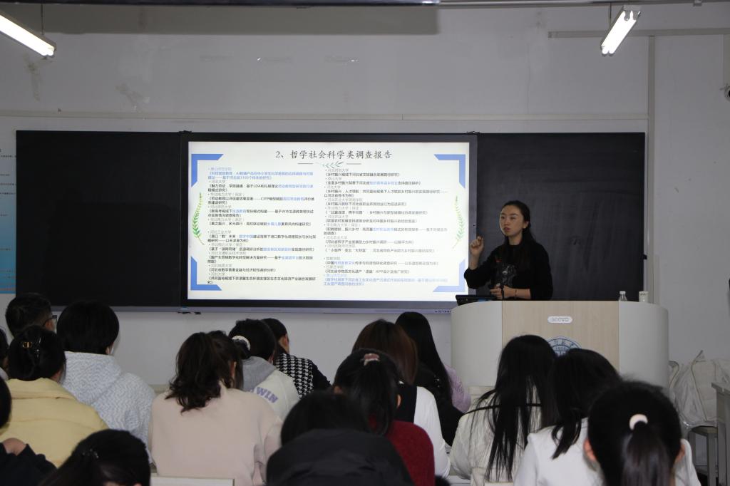 讲座伊始,曹丽君老师详细介绍了挑战杯的赛事类别和优秀参赛案例分析。她以丰富的实例展示了过往优秀挑战杯项目的创新亮点与实践成果,从如何精准定位选题,挖掘具有社会价值与研究深度的项目方向,到运用科学的研究方法开展调研与实验,再到高效整合团队资源、发挥成员优势,都进行了深入浅出的讲解。为在场师生提供了极具价值的借鉴与思考方向。