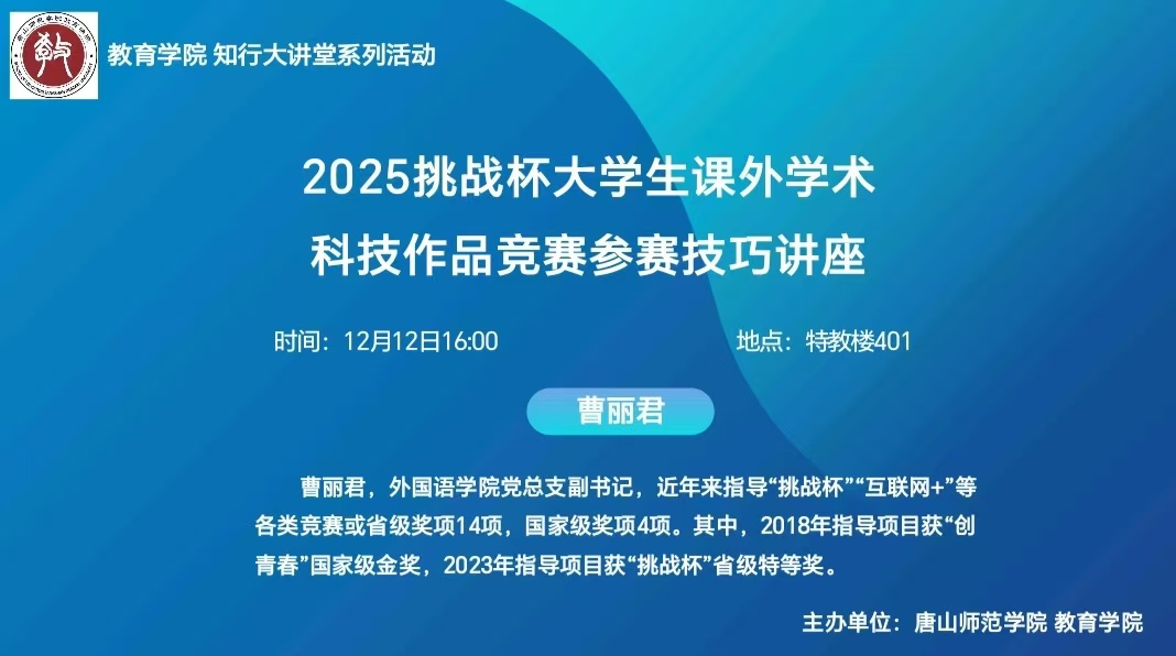 12月12日下午,太阳集团tyc539macau荣幸地邀请到外国语公司党总支副书记曹丽君于特教楼401教室开展“挑战杯”专题讲座,为师生们带来了一场别开生面的学术盛宴与项目指导。