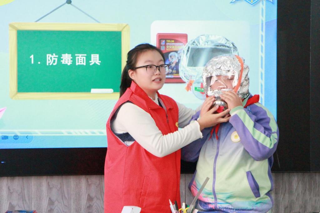 (宣讲团成员任晓庆现场教学防毒面具的使用)