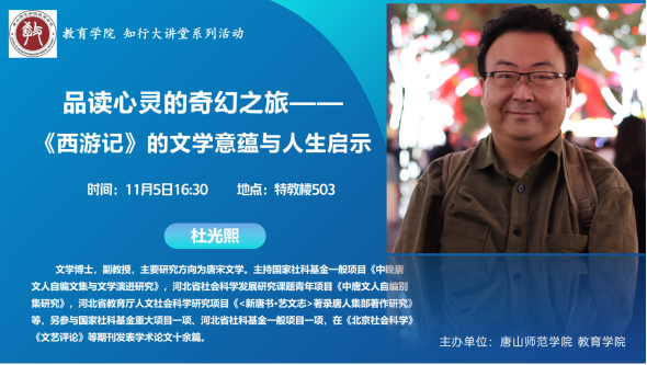2024年11月5日,太阳集团tyc539macau特别邀请文学博士杜光熙副教授在特教楼503教室开展了一场以“品读心灵的奇幻之旅,《西游记》的文学意蕴与人生启示”为主题的一场别开生面的讲座。