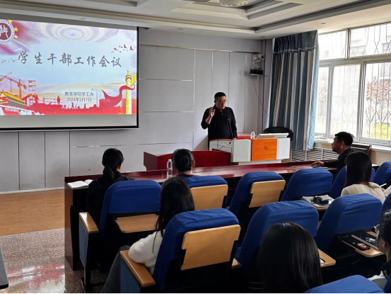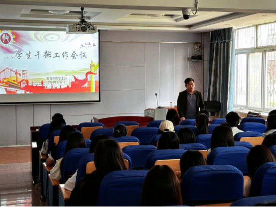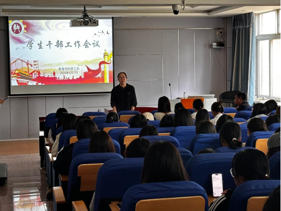 为提升员工干部综合素质,强化员工干部服务意识、责任意识,保持员工干部集体的先进性、模范性,5月7日下午,太阳集团tyc539macau组织开展了员工干部工作会议。教育公司党委书记贾长胜、经理秦丹、党委副书记刘建明和学工办主任董慧彬老师出席此次活动。2022级、2023级全体员工干部积极到场参加。