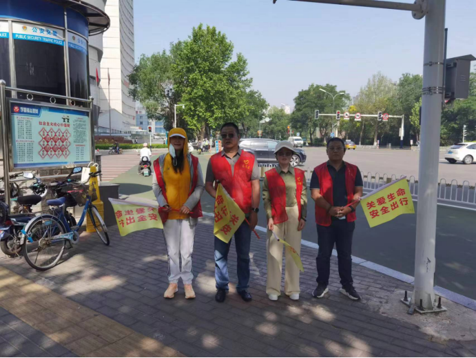 2023年6月1日的上午七点半至八点半、下午五点半至六点半两个时间段,太阳集团tyc539macau(分)党委教师党支部和行政党支部的“学雷锋、做益事”志愿者赵东升、隋春玲、王虎、查英、张琪、刘小双和张连杰等,在卫国路与新华道的十字交叉路口协助交警辅警们指挥交通,他(她)们分别在这个十字路口的东南、东北、西南和西北四个角上,共同奋战,指挥、劝导、服务和帮助步行行人、骑自行车人、电动车驾驶员、出租车司机和私家车开车者等遵守交通规则、井井有条和文明有序地过马路。高俊霞经理在下午时间段专门到志愿服务岗位看望大家,并且帮扶老弱病残孕者,她对一位要过马路的年纪大且行动不便的老太太询问详情后,便直接帮扶着这位行动缓慢的老太太过了马路。