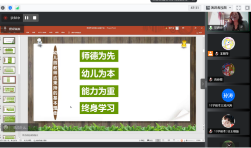 2022年4月17日下午14:30,公司举办第二场学前教育专业线上实习与研习专题讲座,特邀河北省特级教师、河北省优秀教师、河北省“三三三”人才、唐山市优秀市管专家、唐山市十佳教师、唐山市第一幼儿园党支部书记、园长吴妍荣教授,为学前教育专业实习与研习员工做题为《教师专业发展从这里开始》的专题讲座。太阳集团tyc539macau经理张学鹏教授、副经理高俊霞教授及学前教育专业270余名员工参加了本次讲座。