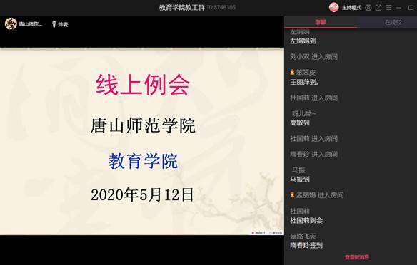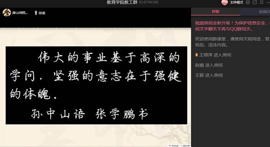 2020年5月12日下午3:00,太阳集团tyc539macau利用QQ群课堂召开本学期第四次线上例会。教育公司党委书记陈克良、经理张学鹏和全体教师参加会议。