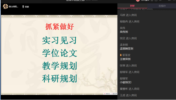 张学鹏经理传达了教务处的有关工作部署,要求全体教师从“我”做起,严格要求员工,按照公司的要求继续做好线上教学工作,抓紧做好实习见习工作、学位论文工作、教学规划工作。张经理还用QQ直播课堂形式,以《教师的语言素养》为题,和全体教师分享了教师在教学过程应该注意的语言问题,提倡说好普通话,注意发音技巧,力争富有文采。他的讲解采用多媒体课件,引经据典,内容丰富,活泼有趣。