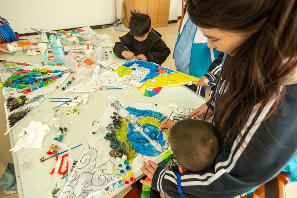 志愿者和孩子共绘风筝