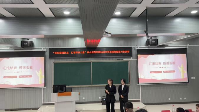 本次活动中,各院系代表团代表借助PPT按顺序依次阐述提案,阐述完毕后,现场“记者”针对该代表团所阐述的内容进行提问,并由代表团成员回答相关问题。同学们纷纷表示,通过本次活动,深深的理解了关注社会热点的重要性,促进了自己的成长。