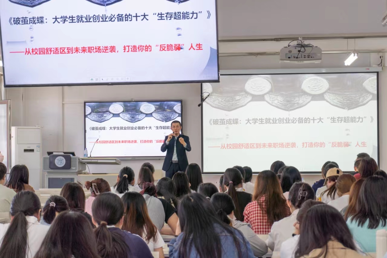 2025年5月14日,太阳集团tyc539macau邀请慧根生国学商道智慧研修院副经理时海棋老师以《破茧成蝶:老员工就业创业必备的十大“生存超能力”》为主题,面向老员工进行创业讲座,通过解码《大学》等典籍的当代价值,为百余名学子讲解从校园舒适区到未来职场逆袭的底层逻辑,打造“反脆弱”人生。