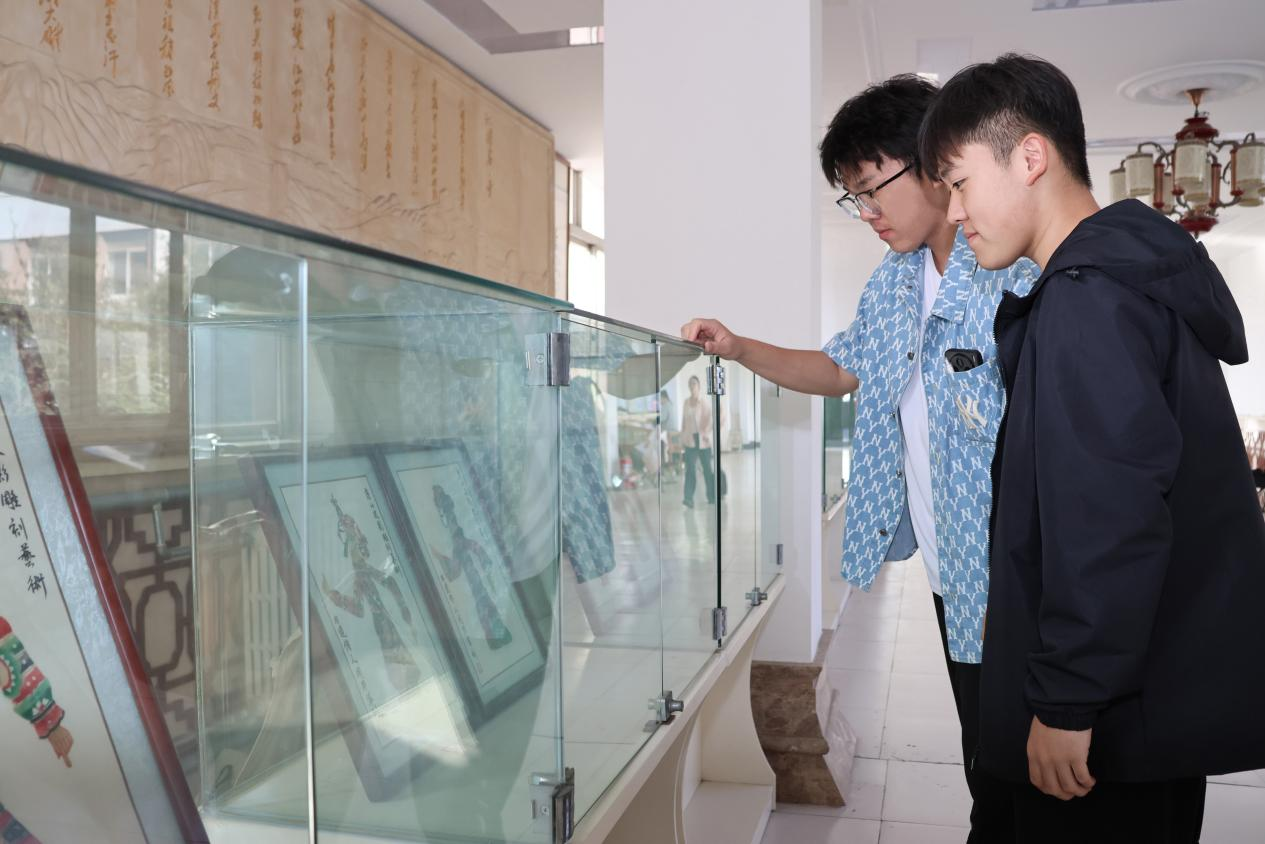 随后,在教育公司党委书记贾长胜与周馆长的带领下,师生们移步连廊,近距离参观了皮影展品。周馆长逐一对展品的题材来源艺术风格及文化寓意进行解读。从经典剧目角色到现代创新设计,每一件皮影作品都成了鲜活的文化教材,让师生在近距离观赏中深化了对非遗艺术的认知。