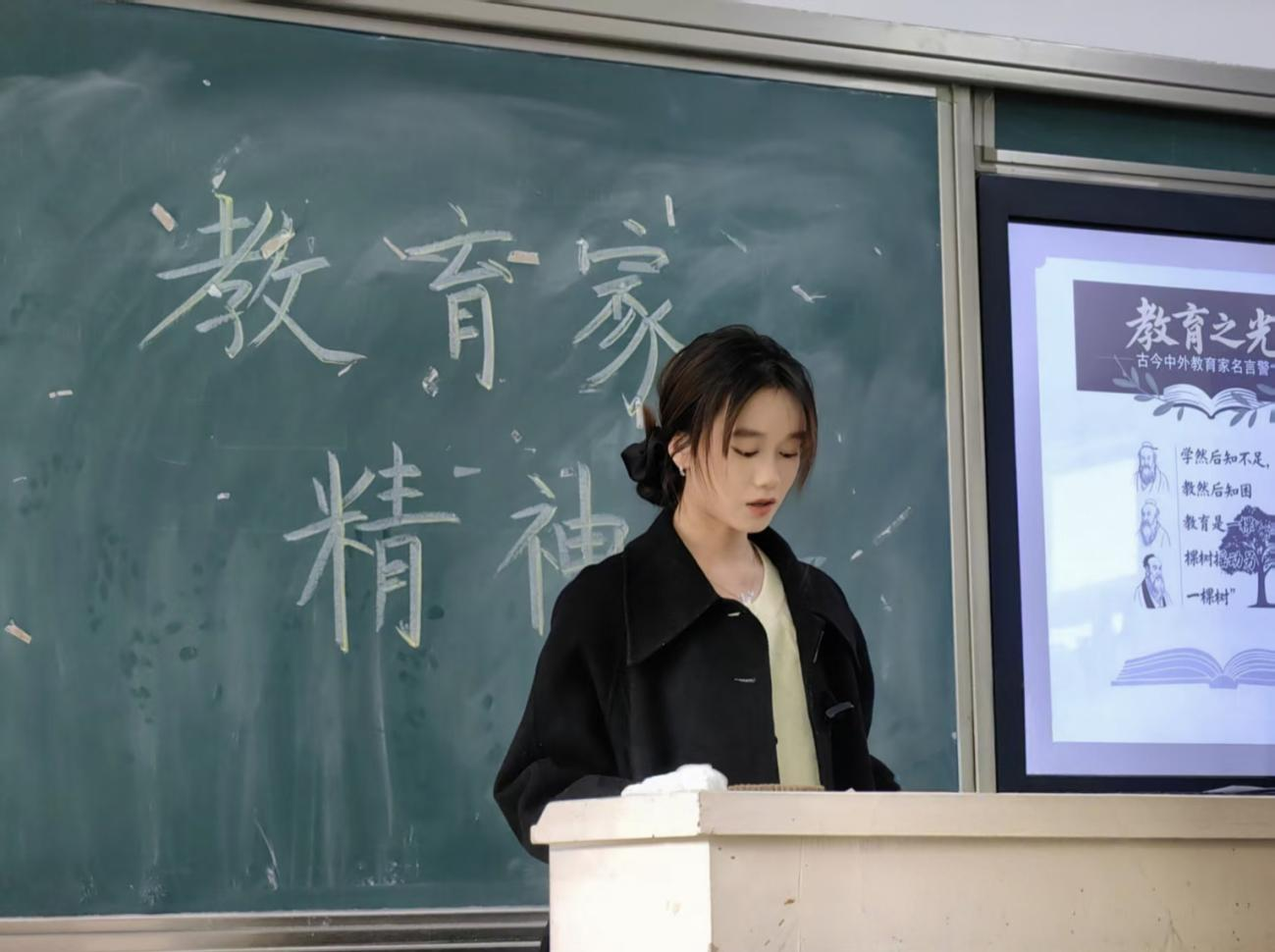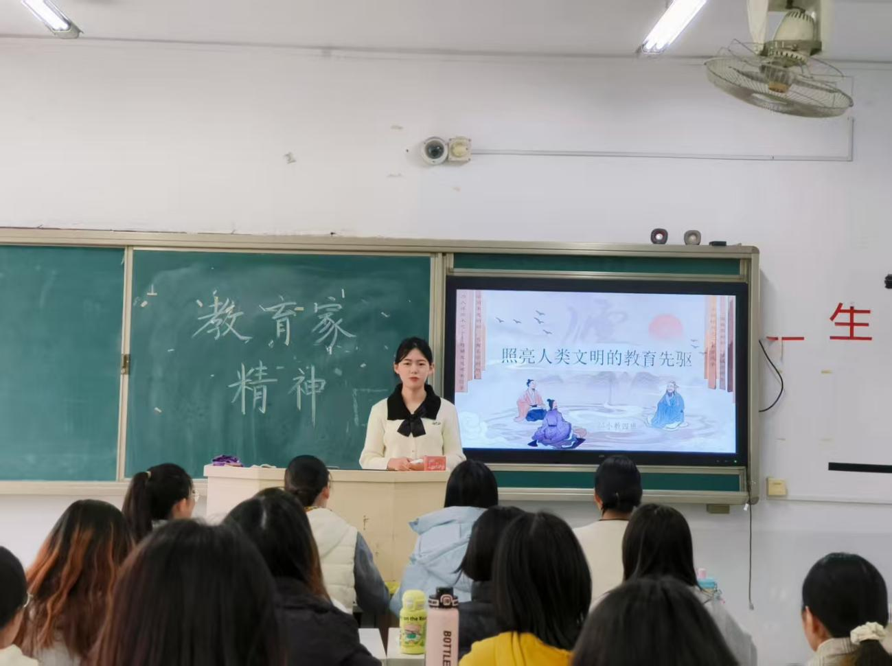 班会氛围升温阶段,杨懿丁配乐朗诵《师道长歌》,以深情演绎诠释教育家精神。此后,王奇玮、马晓玉分别分享苏格拉底与叶圣陶的教育故事:王奇玮详解“产婆术”启发式教学,并结合小学课堂实例说明实践方法;马晓玉围绕叶圣陶“生活即教育”“教是为了不教”理念,强调小学教育需贴近员工生活,主持人同步引导同学们结合专业展开讨论。