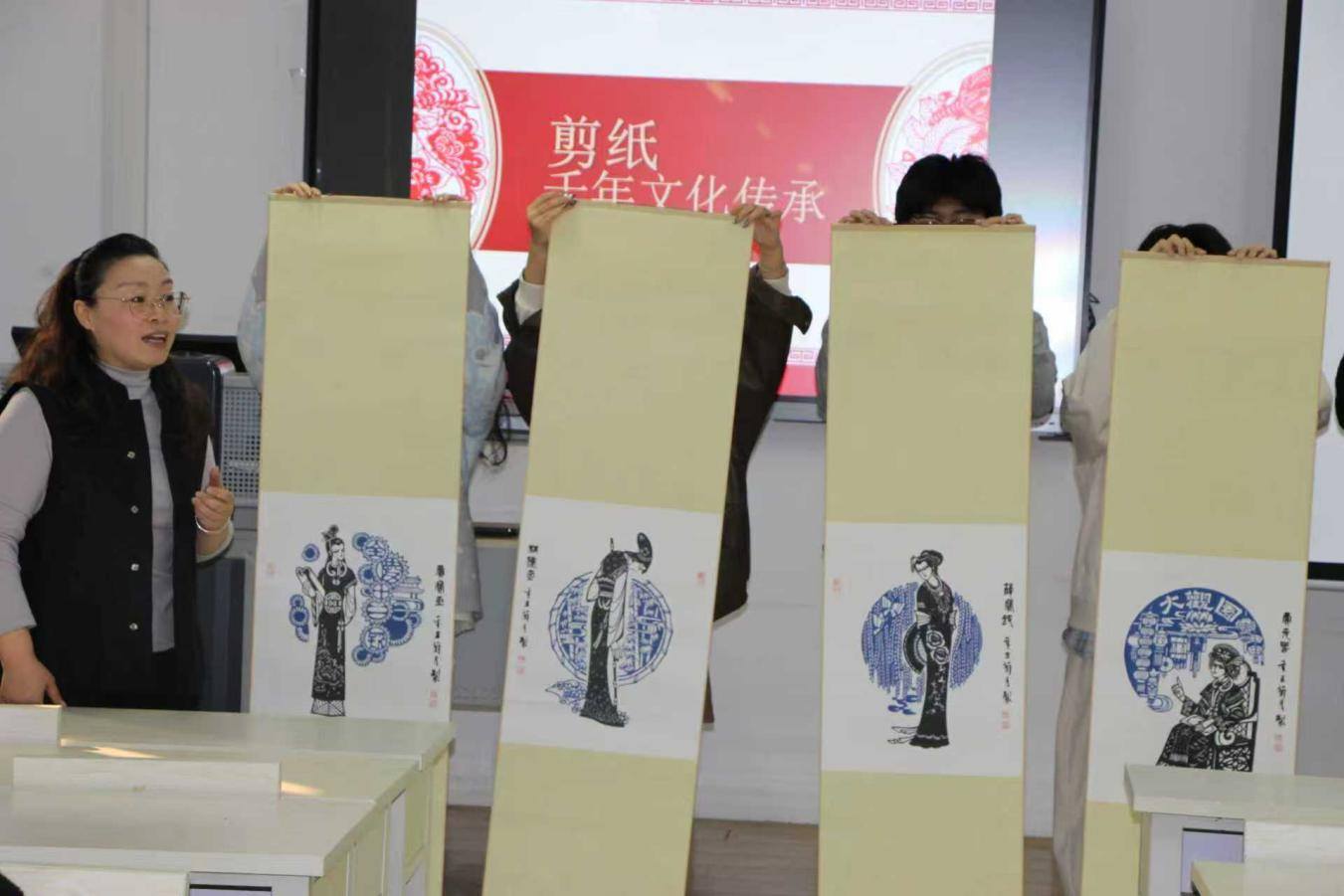 除了文化解读,李旺老师还介绍了剪纸的分类逻辑——从用途分为民俗剪纸、装饰剪纸,从技法分为阳刻、阴刻、阴阳混刻,并结合当下的文创实践案例,展示了剪纸与文具、服饰等现代产品的融合形式,让大家看到传统技艺在当代生活中的创新活力。“剪纸不是‘老物件’,它可以是年轻人背包上的装饰,也可以是文创产品里的创意,传承的核心是让它‘活’在当下。”李旺老师的分享,让现场师生对非遗传承的“守”与“新”有了更深的理解。