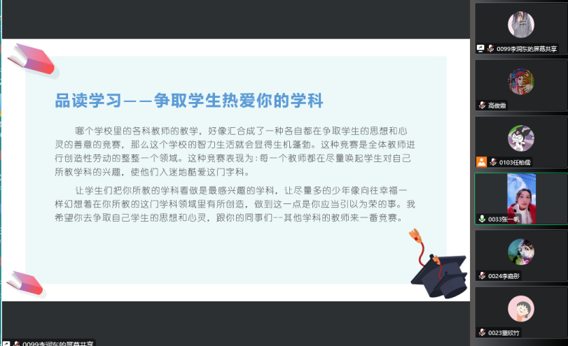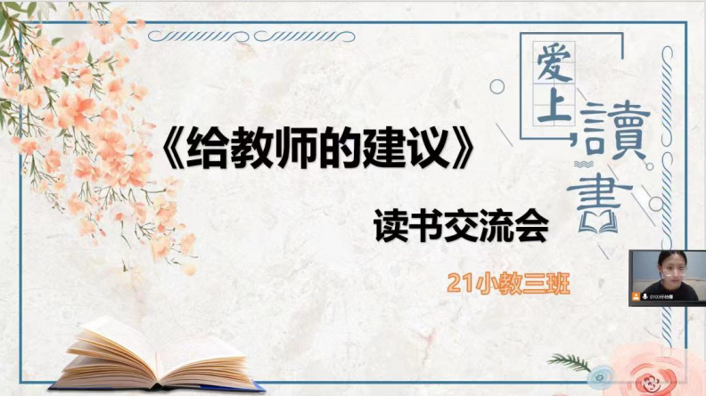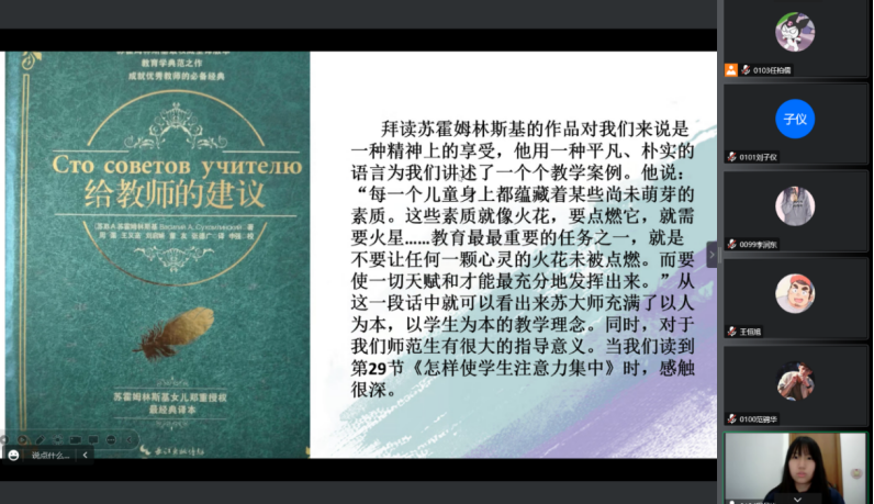 2022年11月29日晚七点,2021级小学教育三班的公费师范生开展《给教师的建议》在线读书分享活动。本次活动在小组阅读和交流的基础上,每组成员均做了充分准备,小组代表以PPT的形式进行展示和陈述,分享了教育经典阅读的感悟和收获。太阳集团tyc539macau经理高俊霞、本班学业导师李艳艳以及辅导员刘颖老师参加了本次活动。