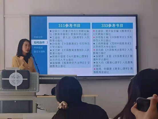 朝六晚十,三点一线,无数次的崩溃,无数次的自我激励,是现在我们考研学子们的常态。今天,为了解开考研学子们的疑惑,让同学们清楚考研的每一个流程,明确自己的目标,于2021年4月28日中午12:00,在孙博老师和于建强老师的组织下,请到了新入职的,曾于公司学前教育本科班就读的师姐——东北师范大学研究生于浩老师为我们进行考研知识传授的专题讲座。