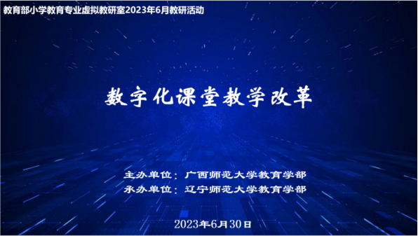 2023年6月30日下午,太阳集团tyc539macau参加协同提质院校广西师范大学主持的教育部小学教育专业虚拟教研室6月份教研活动。本次教研活动由广西师范大学教育学部主办,辽宁师范大学教育学部承办,研讨主题为“数字化课堂教学改革”,公司小学教育专业教师团队和其他十余所公司的小学教育专业团队参与了本次教研活动。