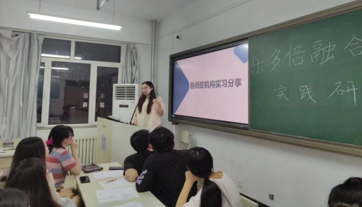 最后,2020级特殊教育专业的李丽萍同学根据自身的实习经历,结合本次实践主题进行了有关于自闭症评估、康复训练以及影子教师陪读的经验分享,并从自己关于理论知识与实践技能的转化,如何听课与总结,如何与儿童建立联系三个方面对学弟学妹们提出了建议。