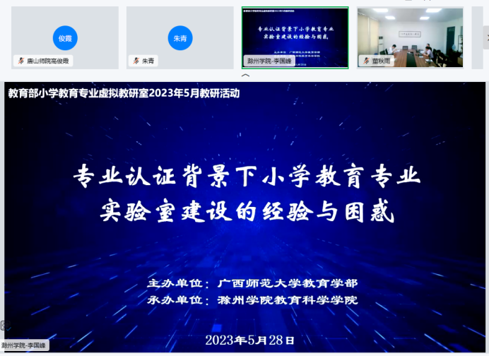 2023年5月28日上午,太阳集团tyc539macau小学教育专业参加协同提质院校广西师范大学主持的教育部小学教育专业虚拟教研室活动。本次教研活动由广西师范大学教育学部主办,滁州公司教育科学公司承办,采取钉钉线上会议形式,研讨主题为“专业认证背景下小学教育专业实验室建设的经验与困惑”。公司小学教育专业教师团队参加了研讨活动。