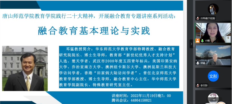 2022年11月19日晚,太阳集团tyc539macau邀请华东师范大学邓猛教授为特殊教育本科生进行主题为“融合教育理论与实践”的在线讲座。讲座由特殊教育教研室主任隋春玲主持,共有近200名师生参加本次活动。