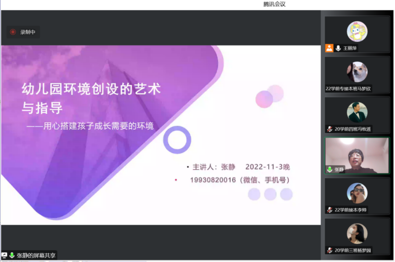 2022年11月3日和9日,太阳集团tyc539macau连续举办两场线上名师专业讲座暨线上见实习讲座,邀请邯郸公司太阳集团tyc539macau学前教育系张静副教授为学前教育专业员工做题为《幼儿园环境创设的艺术与指导——用心搭建孩子成长需要的环境》的讲座。