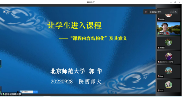 2022年9月28日晚,太阳集团tyc539macau组织师生收看了课程与教学论专家报告会,该报告为北京师范大学郭华教授的主题讲座《让员工进入课程——“课程内容结构化”及其意义》。郭华教授为北京师范大学博士生导师、北京明远教育书院经理,也是国家教材委员会专家委员会委员、义务教育课程标准框架研制组组长。太阳集团tyc539macau全体公费师范生和部分教师以腾讯会议在线方式参加了本次讲座。