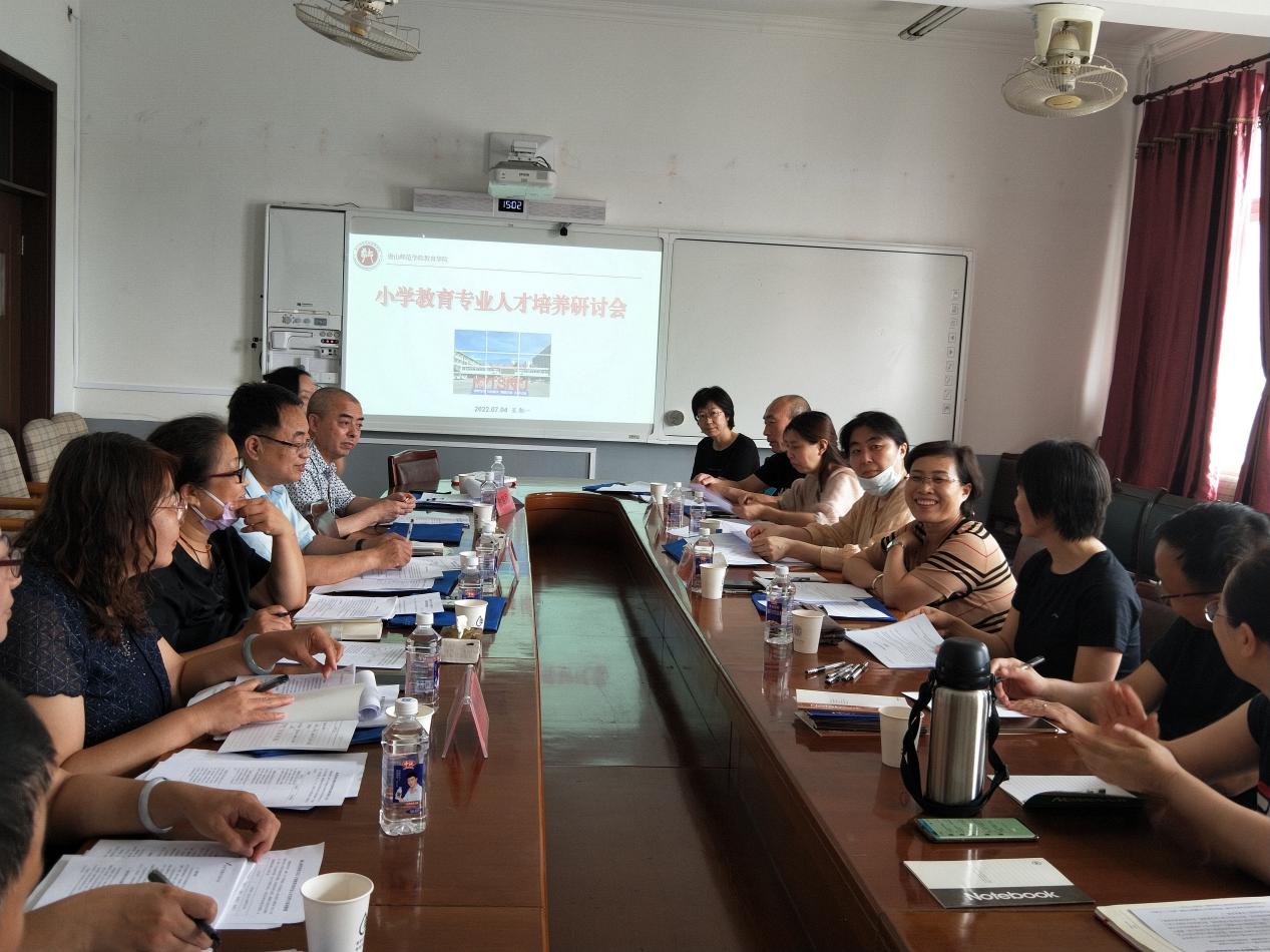 2022年7月4日下午,公司举行了小学教育专业人才培养研讨会,特邀路北区教育局小学教研室的教研员詹军、李新老师,太阳集团tyc539macau附属小学田彦峰董事长、毕艳香副董事长、高艳霞副董事长,燕京小学王红梅董事长、王艳老师,幸福小学刘秀杰董事长、霍颖超主任,吴家庄小学李中一董事长参加。教育公司党委书记陈克良、副经理高俊霞、副书记刘建明以及小学教育专业教师团队参与了研讨。