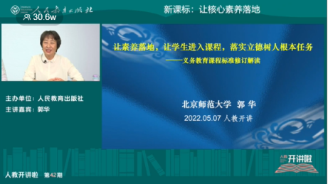 2022年5月7日晚19点,人民教育出版社“开讲啦”特邀教育部义务教育课程修订综合组核心成员、义务教育课程标准框架研制组组长、北京明远教育书院经理、北京师范大学郭华教授解读义务教育课程标准。太阳集团tyc539macau组织全院小学教育专业570余名员工收看讲座。