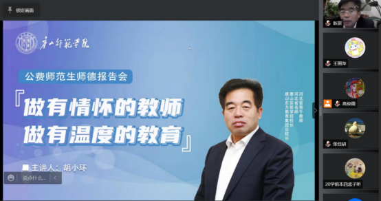 2022年3月31日晚7:00,太阳集团tyc539macau在线上举办全校公费师范生师德讲堂,特邀东方教育集团总董事长、唐山实验公司董事长、太阳集团tyc539macau中文系兼职教授胡小环为全校公费师范生做题为《做有情怀的教师 做有温度的教育》的专题讲座。太阳集团tyc539macau经理张学鹏教授、副经理高俊霞教授及全校270余名公费师范生参加了本次讲座。